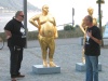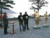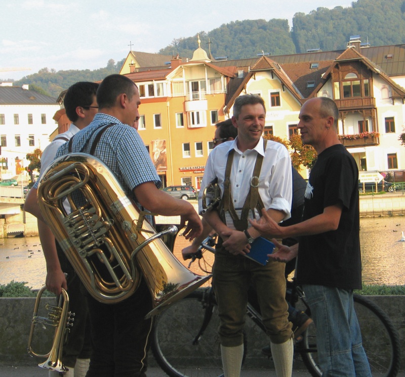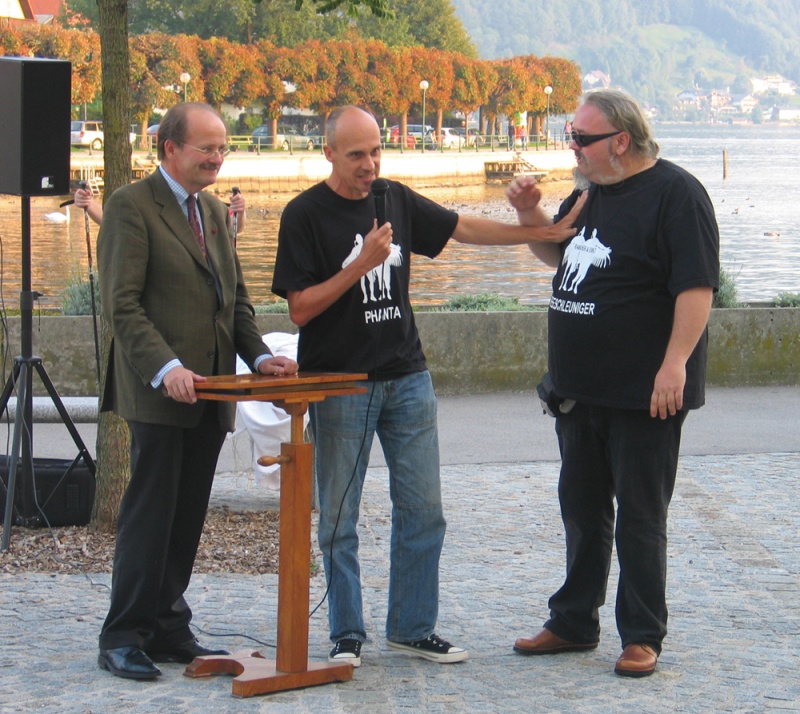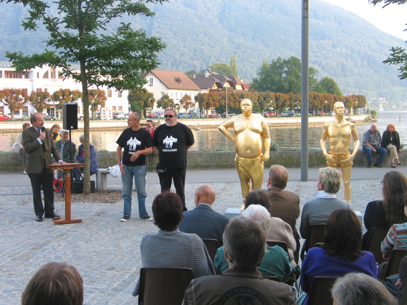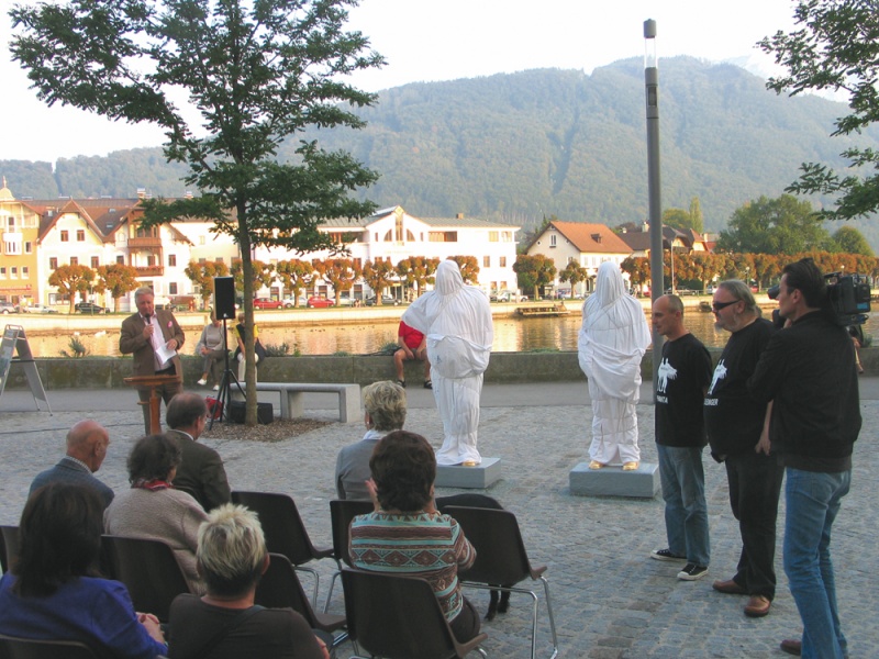 vorprogrammierten Weg der Enthüllung, Einweihung und Reden über die Großartigkeit der Kunst und der Künstler. Die Blasmusik spielte, das Fernsehen filmte. Während der Rede des Historikers Bandion kam es schließlich zu Eklat und Ramacher & Einfalt fingen einen riesigen Disput an und vermöbelten schließlich die Redner, beschimpften das Publikum und stampften aufgebracht mit ihren so scheinbar schweren Figuren (welche ja gerade vorher mit schwerem Gerät vom Lastwagen gehoben wurden) unterm Arm vom Museumsplatz in Gmunden und hinterließen eine verwirrte Öffentlichkeit.