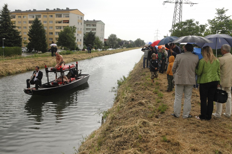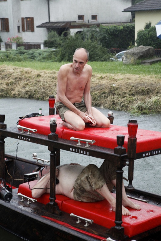 Diese Performance entwickelten wir in Anlehnung an die antike, griechisch- mythologische Geschichte des Fährmannes Charon, der die Verstorbenen gegen einen Obolus in den Hades beförderte. Unser Totenschiff ist ein 6m langes und eigens dafür gefertigtes Objekt. Gesponsert und gefördert wurde dieses Projekt vom Land NÖ anlässlich des Viertelsfestifals 2011, sowie von Writzmann & Partner und wurde am Wiener Neustädter Kanal veranstaltet. Durch widrige Wetterbedingungen (Kälteeinbruch und heftiger Regen) fanden wir uns dann ganz schnell im Hades wieder und büssten unsere Sünden.